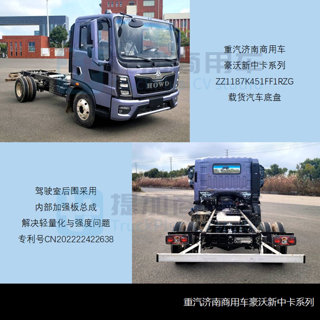重汽旗下济南商用车申报了ZZ1187K451FF1RZG载货汽车底盘,采用全新驾驶室:纵向前大灯略有五十铃痕迹,大面积封闭式熏黑前中网,配合上方欧卡MAN式、加装logo的飞翅镀铬装饰件,副驾驶门板下方带玻璃观察窗、和日卡HINO有些相似,整体宽2410mm、前/后轮距1848/1804mm,仍属大中卡规格。该款驾驶室后围采用内部加强板总成以解决轻量化与强度问题,并申请了相关专利,从正文来看还有排半驾驶室可选,可知未来必做更多系列化申报。该底盘轴距3.6米,整备质量4550kg,准乘2人,前8、后9+8片板簧悬挂,匹配潍柴4.58L、220马力/162kW柴油机,最高车速89/95km/h。