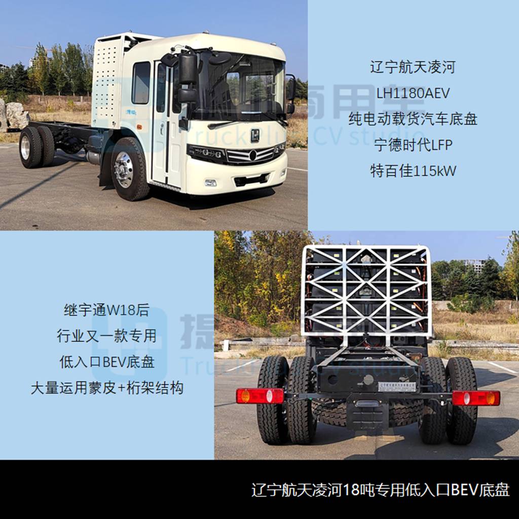 辽宁航天凌河本批申报了LH1180AEV纯电动载货汽车底盘,这也是继宇通集团W18系列后,N类货车行业又一款低入口BEV专用底盘,而且更像是M类客车,大量运用了蒙皮覆盖件和桁架结构。该底盘驾驶室较为简易,采用主驾驶单门+副驾驶折叠门结构,可选折叠门下观察窗,很好适应城市工况、尤其是路面观察,车宽2.5米、准乘3人,车高2865mm较宇通W18更低,外观也与中巴更为相像,搭载宁德时代LFP动力电池、驾驶室背置方案搭配桁架框架结构。该底盘全长7965mm、轴距4.3米,整备质量7380kg,前10、后10+9片板簧悬挂,匹配特百佳115kW驱动系统(功率有点小?),最高车速89km/h,是一款“再进一步”的城市专用底盘。