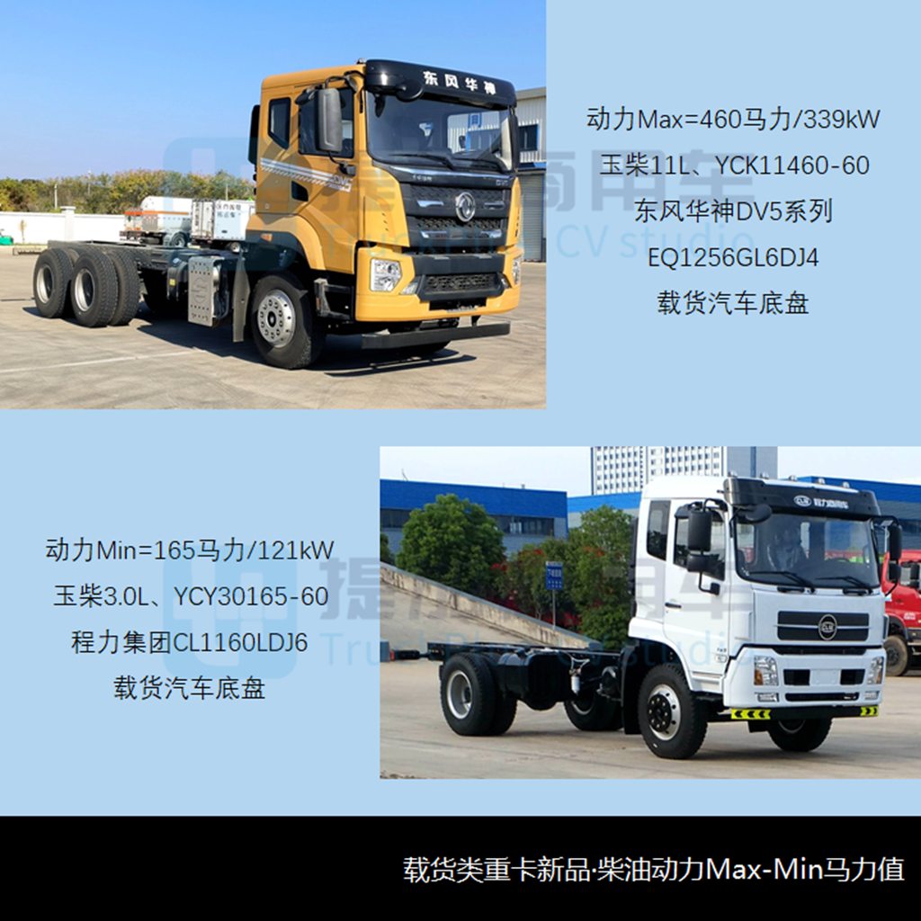 动力Min=165马力/121kW,即玉柴3.0L的YCY30165-60柴油机,由程力集团CL1160LDJ6载货汽车底盘采用,沿用了老款东风天锦驾驶室,最新归类为天锦VR系列依然在产。该底盘GVW=16.2吨、整备质量4.11吨,轴距3950mm,准乘2/3人,前8、后10+8片板簧悬挂,还可匹配云内3.0L、170马力柴油机,最高车速89km/h。该底盘与CL5160GPSA6DP绿化喷洒车和CL5160TDYA6DP多功能抑尘车同期申报公告,在专底领域可谓“宝刀不老”。