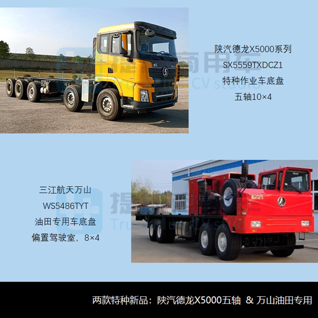 - 陕汽集团申报了SX5559TXDCZ1特种作业车底盘,采用德龙X5000系列驾驶室、准乘2/3人,全长10.63/11.65米,双前桥14片、驱动桥12片板簧悬挂+第三轴不可提升空气悬挂随动桥,五轴10×4驱动形式,搭载潍柴11.6L、460马力柴油机,最高车速89km/h。