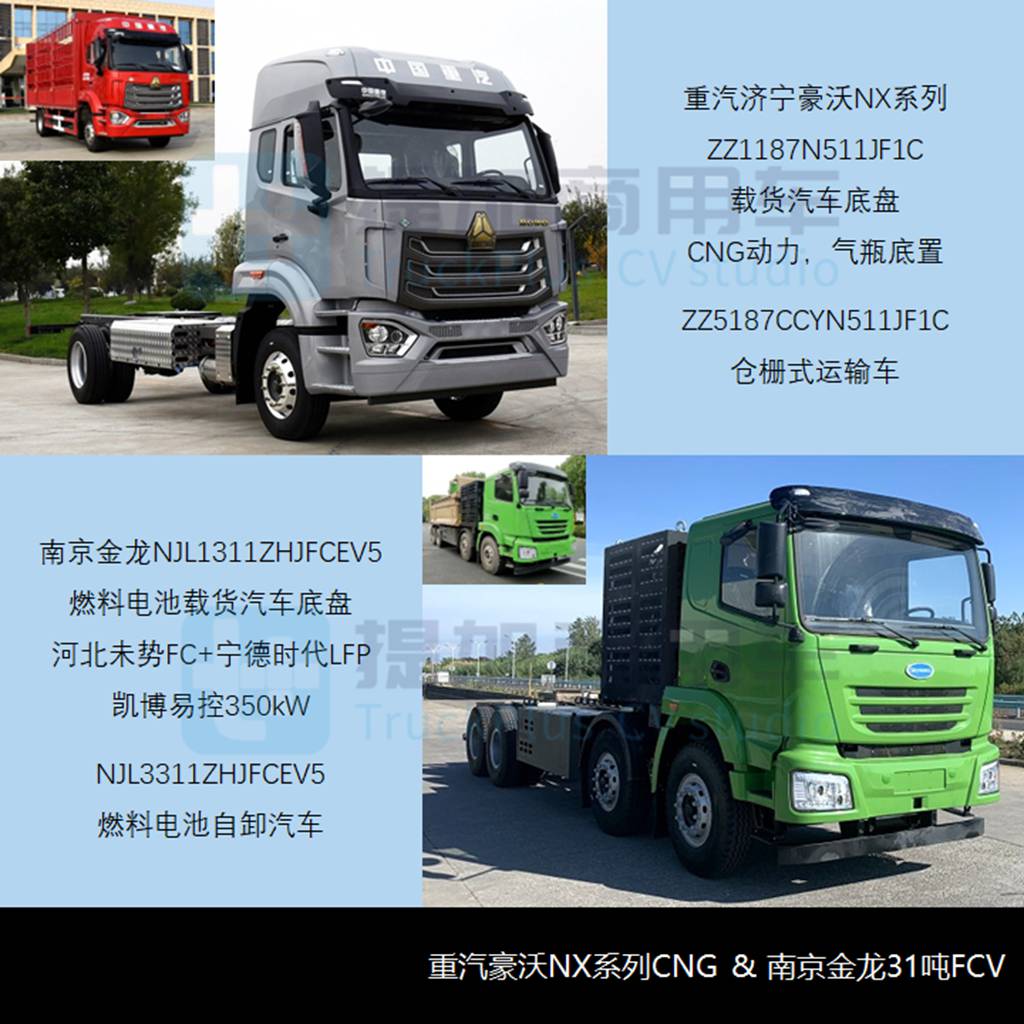 - 重汽济宁申报了ZZ1187N511JF1C载货汽车底盘,采用豪沃NX系列驾驶室、准乘2/3人,轴距5.1米,CNG动力气瓶底置、布置于轴间车架两侧,搭载重汽6.87L、290/260马力气体机。该底盘与ZZ1187N511JF1C仓栅式运输车同期申报公告,形成整车后全长9米,货箱长6.7/6.75米、额定载质量9145-9990kg、载质量利用系数1.28/1.07。由于整车为载货类的基型车,因此尽量减少储能装置对货箱的影响也必须在考虑范围内。