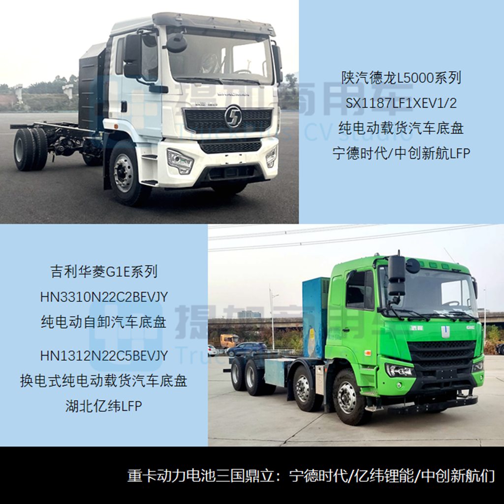 - 陕汽集团申报了SX1187LF1XEV1/2纯电动载货汽车底盘,采用德龙L5000系列驾驶室,可选择宁德时代或中创新航LFP动力电池。吉利华菱则与湖北亿纬合作,申报了远程G1E系列HN3310N22C2BEVJY纯电动自卸汽车底盘和HN1312N22C5BEVJY换电式纯电动载货汽车底盘,分别采用423.936度和350.208度LFP动力电池,续航里程350和270公里,与自卸版和混凝土搅拌运输车同期申报公告。