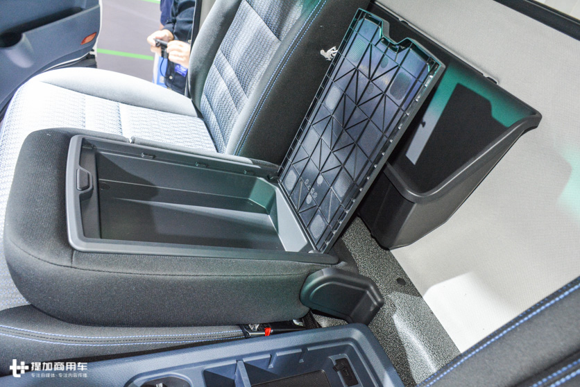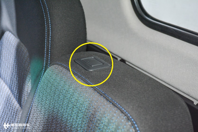 车内共3个座椅,中间座椅可以放倒成为储物盒,放倒座椅的方法很简单,按一下座椅顶部就可以,这是我目前在轻卡里面见过最简单省力的操作方式。