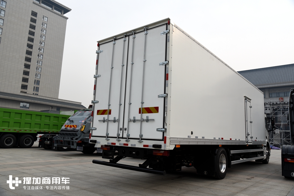 于此同时,现场还展出了M6000载货车和H6000牵引车,其中,M6000是一辆12米的单轴载货车,与此同时,这款车还配置有额外的托挂钩,如果嫌货箱容积不够的话,它还可以再拖一个货箱,作为一款中置轴双货箱载货车来用,可以说,它非常适合国内的快递行业使用。