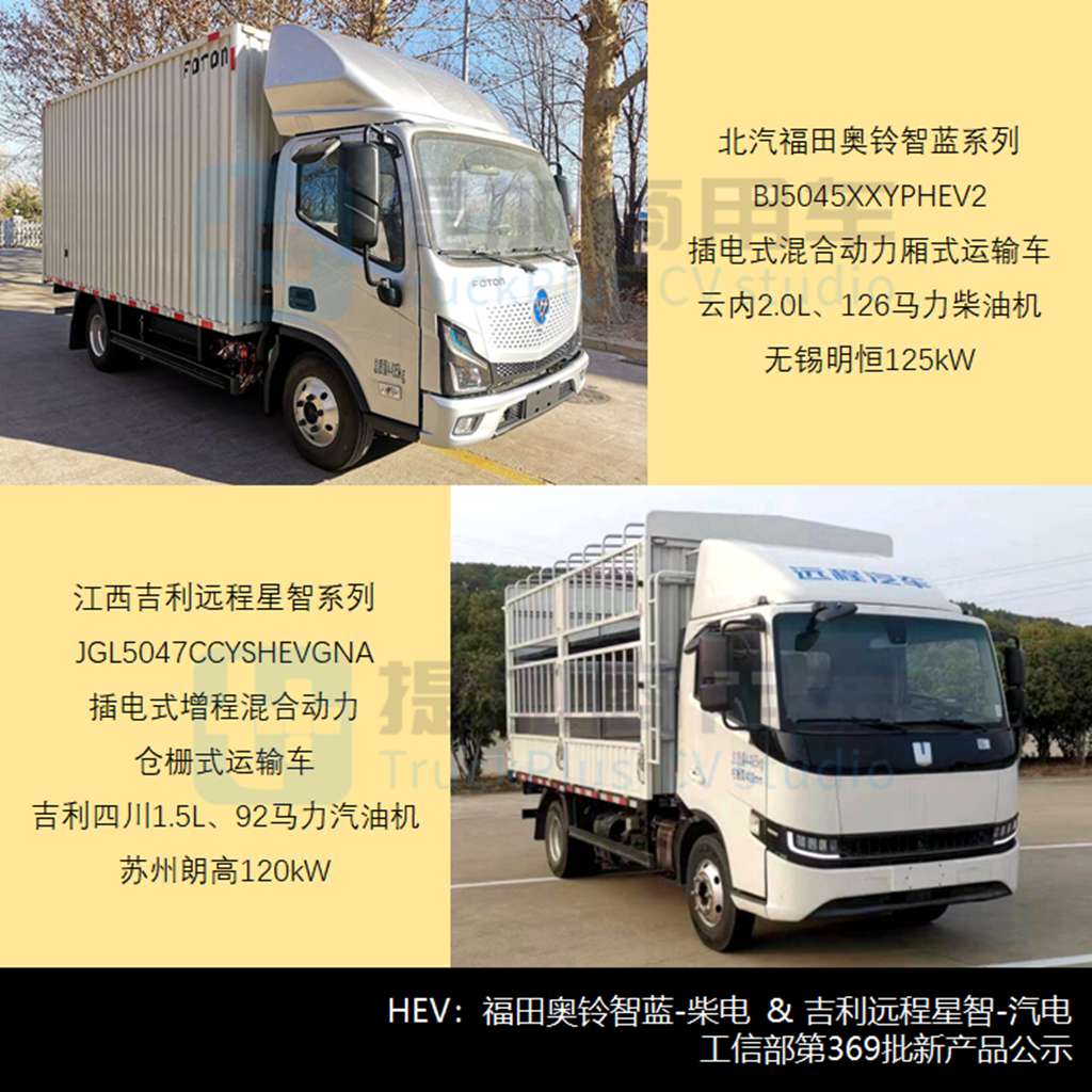 - HEV根据燃料动力可分为柴油、汽油、NG等化石燃料与电动混合的多种形式,亦可采用增程式REEV模式(发电模块)。本批新品包括九款柴电混动和一款气电混动,主要集中在4.5吨蓝牌轻卡领域。至于N1类混动则未见新品申报,N类基型车有望被皮卡或小卡类新品填充,而M类基型车已有厦门金龙的日系海狮轻客冷藏车和少量乘用类改装的专用车。