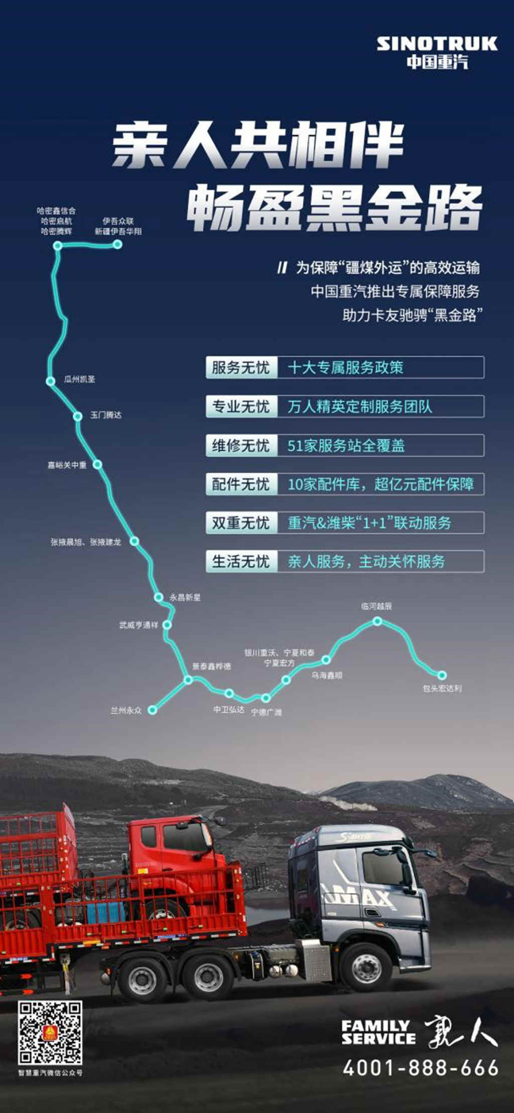 新疆煤场内虽是车辆大排长龙的盛况,但整个西北却是一片荒凉无垠。中国重汽“亲人”服务将“哈密淖毛湖-瓜州-嘉关-张掖-中卫-银川-乌海-包头”设为煤炭运输重点服务线路,沿途增设多家服务站点,实现51家服务站广泛覆盖,50公里服务半径,让客户在地广人稀的西北也感受到“亲人”的温度。