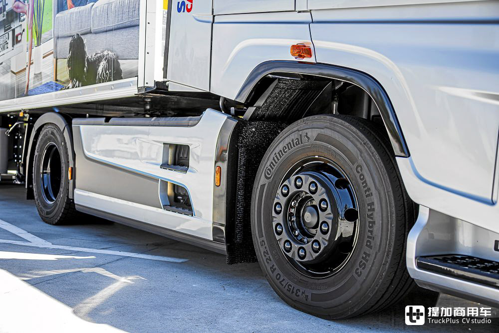 视角继续向下:实拍的福特F-MAX Blackline Edition采用了熏黑的轮毂,并配备哑光黑色的轮毂装饰罩。轮拱等地亦采用了熏黑质感,与整车的黑化风格相匹配。全包侧裙亦是F-MAX Blackline Edition的标配,上方设计有黑色拼色装饰,起到降低风阻、增强视觉效果的作用。右侧裙带有两级登车踏板,而左侧则并没有踏板。假如驾驶员需要接驳挂车,那就必须下车后绕到车辆右侧才能使用踏板,比较奇怪。
