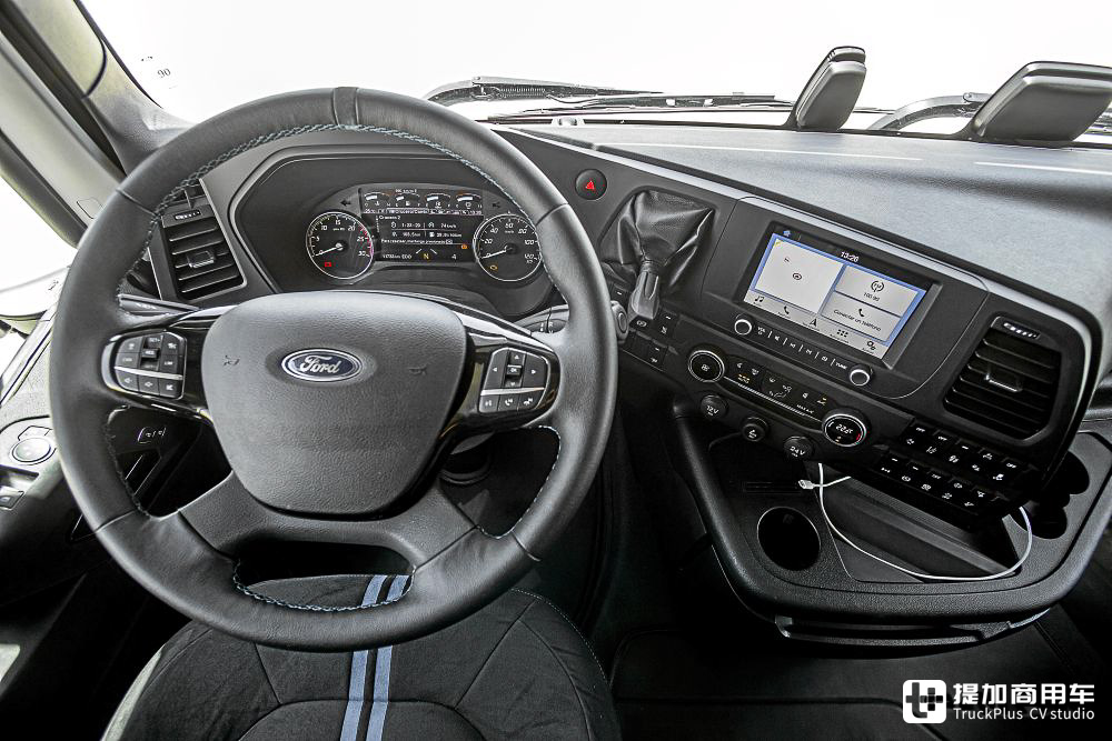 在人体工程学方面,福特F-MAX采用了类环抱式的仪表台设计,仪表台控制区面向驾驶员,更加便于操控。在仪表台上方,车辆配备了一块7.2英寸的多功能显示屏,是车载的多媒体中心。
