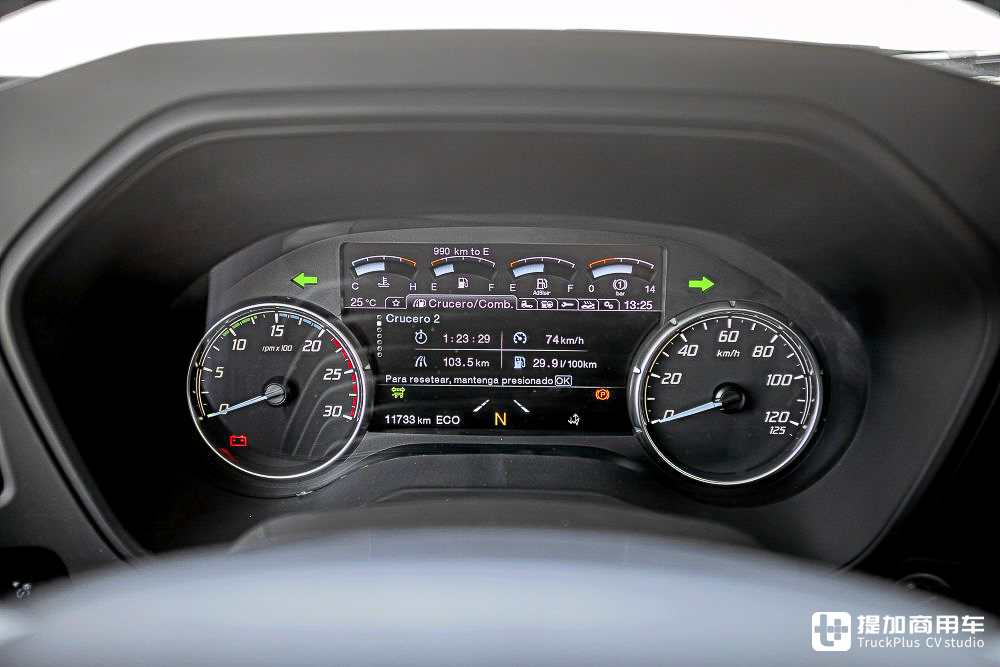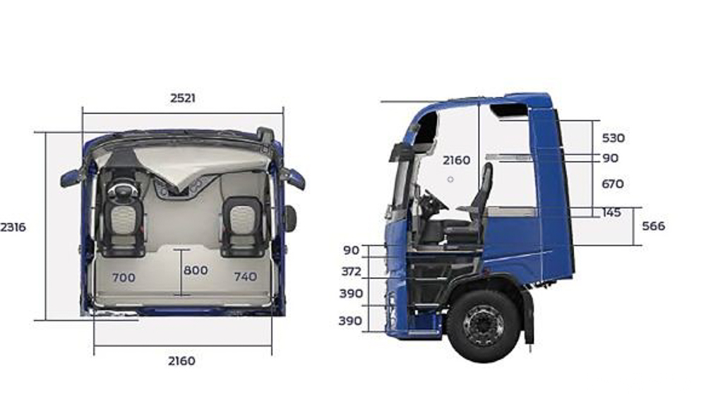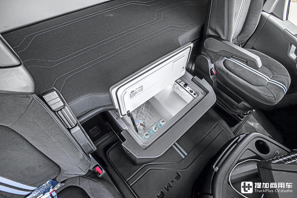 驾驶室内部的发动机鼓包较小,高度仅为9厘米。再加上近2.2米的驾驶室最大内高,车内的纵向空间可谓相当宽敞,驾驶员可以轻松在驾驶室内站直。