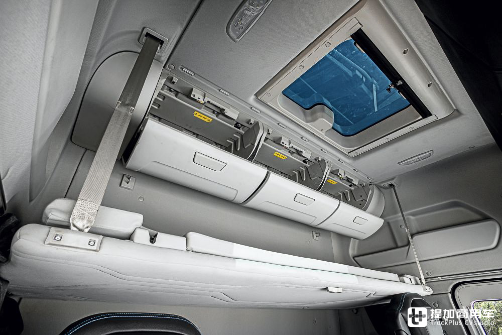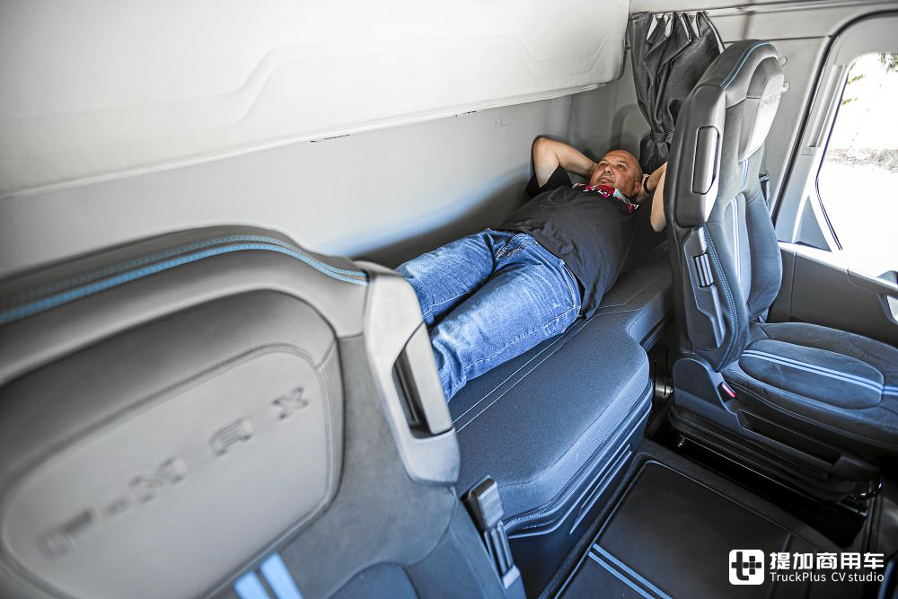 卧铺采用非等宽设计,两边宽度分别为700毫米和740毫米,中间最宽处可达800毫米,这一参数并不出众。不过,较厚的床垫能够提供舒适的睡眠。在最新款的福特F-MAX上,车辆还可选装类似达夫的电动调节卧铺,更加贴合身体曲线,还可当作沙发床使用。