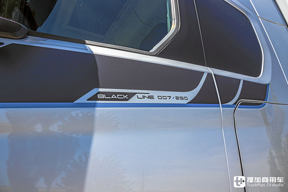 在侧窗下方,同样带有黑色饰条及Shelby Blue蓝线饰边。并且,福特在此处设计了Blackline Edition车型专属的限量标志,用以彰显车辆身份。可以看到,这台F-MAX是250台限定版当中的第七台。