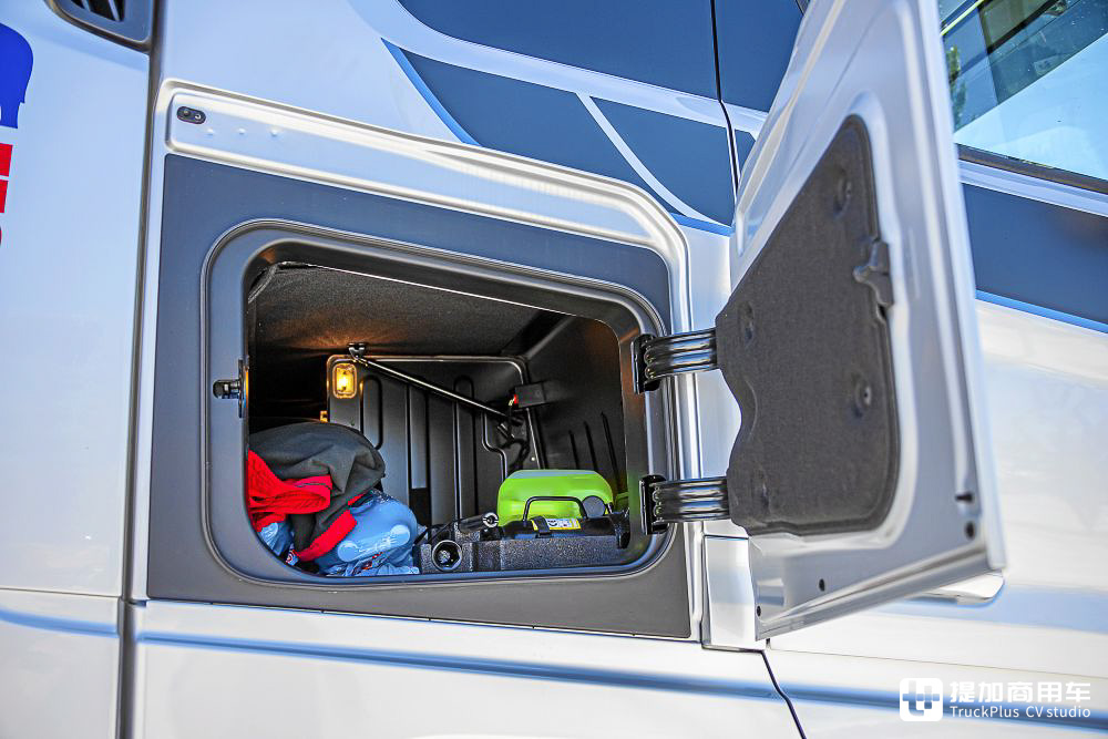 侧储物箱采用侧开门的设计,内部空间表现尚可。为了兼顾车辆线条设计,储物箱门被设计成了不规则矩形,并且舱口造型也类似梯形。