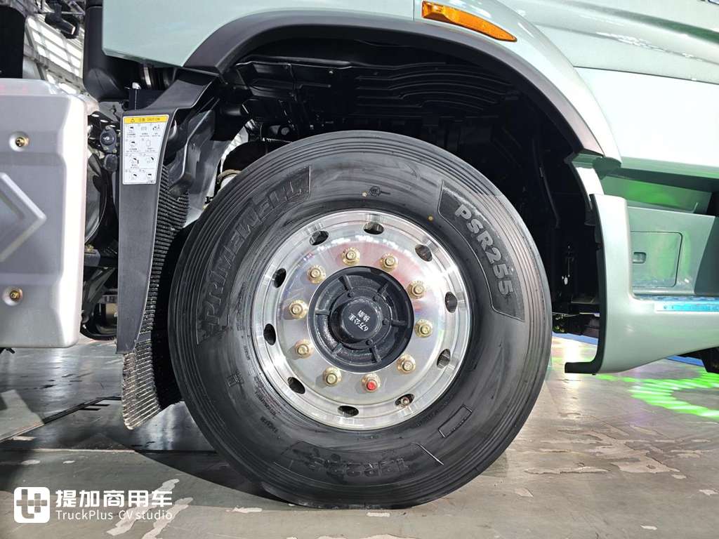 乘龙H5V全车轮毂均采用铝合金轮毂,搭配12R22.5真空轮胎,包括车辆备胎也为相同配置。全车11只轮胎总减轻重量超过200公斤,如果搭配挂车全铝合金轮毂,整车减重轻松超半吨。