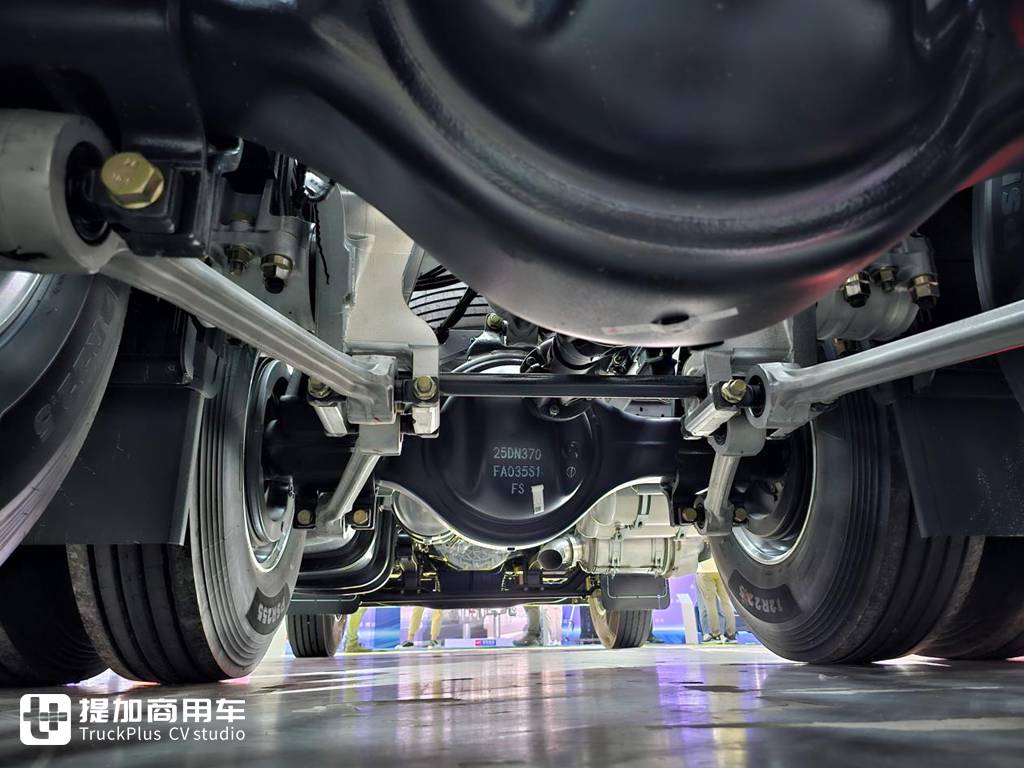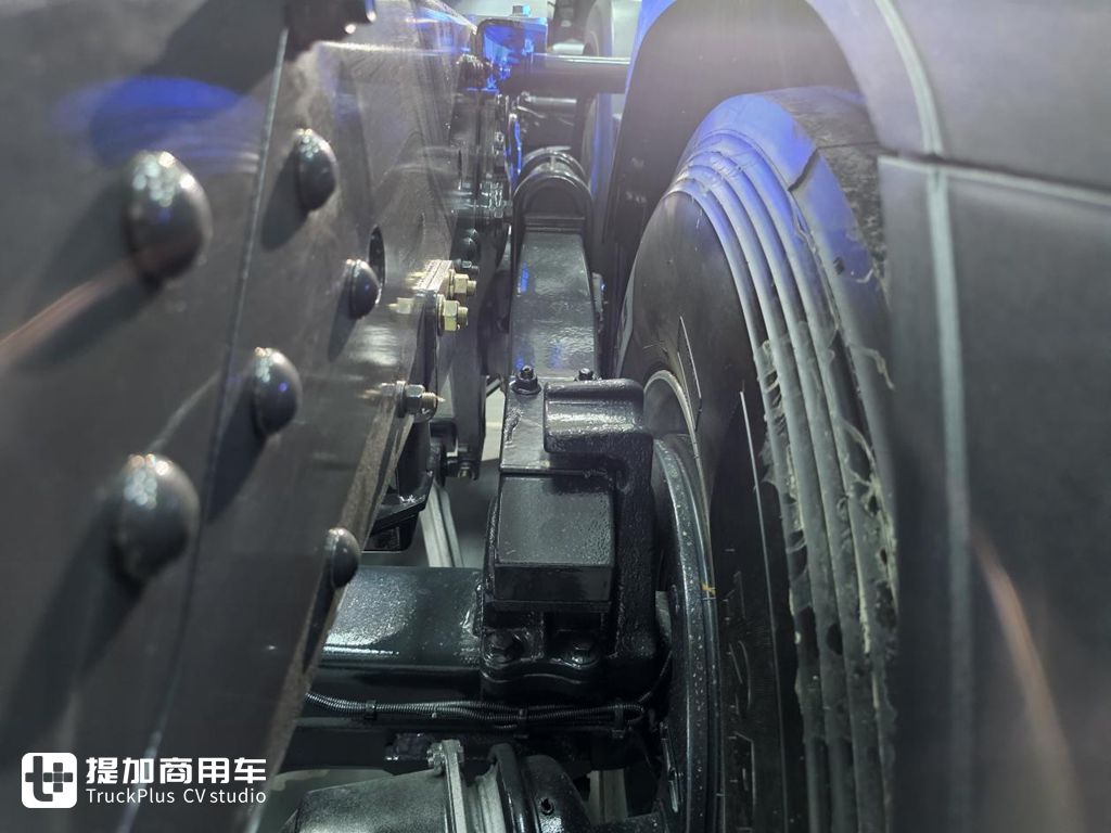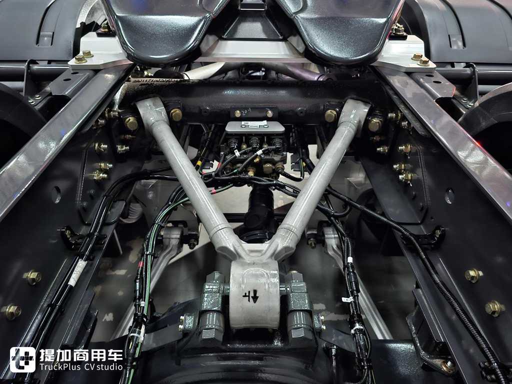 全车的V型推力杆与平衡轴也采用了铝合金材质,这个在重卡上非常不多见,属于是很有创新的轻量化措施。
