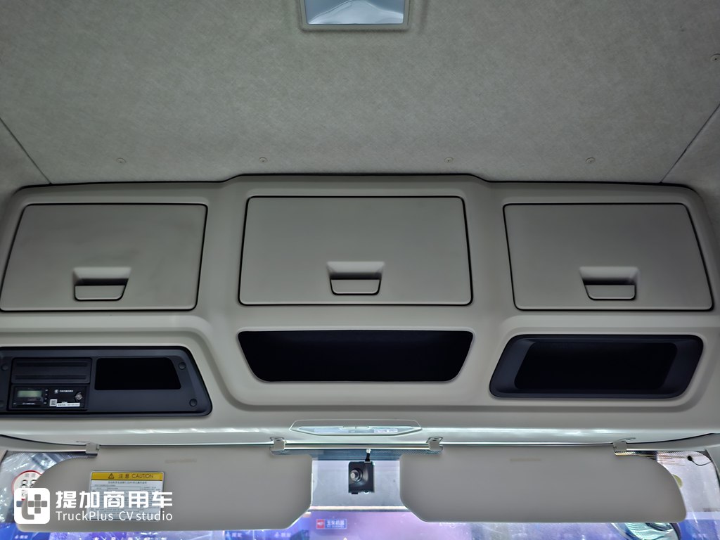 因为该车定位以中长途运输为主,所以乘龙H5V采用高顶双卧的驾驶室布局,车内平地板结构净高度超过1900mm,重新设计的内饰也有着较高的空间利用率,车内储物设施高达22处,总容量640L。