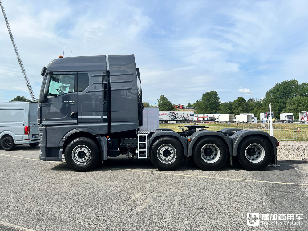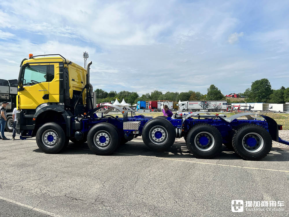 场上还有一台相当特殊的曼恩TGS底盘,它由曼恩卡车官方合作改装商:Toni Maurer魔改而成。在8x4底盘的基础上,Toni Maurer为车辆增添了一根提升桥,将驱动形式变为10x4。新增的第三桥可进行提升,在它的加持下,整车的GVW来到了50吨左右,可用于改装随车吊及重型自卸车等特种车。这种改装对于Toni Maurer来说简直小菜一碟,他们还改装过许多性能逆天的曼恩卡车。