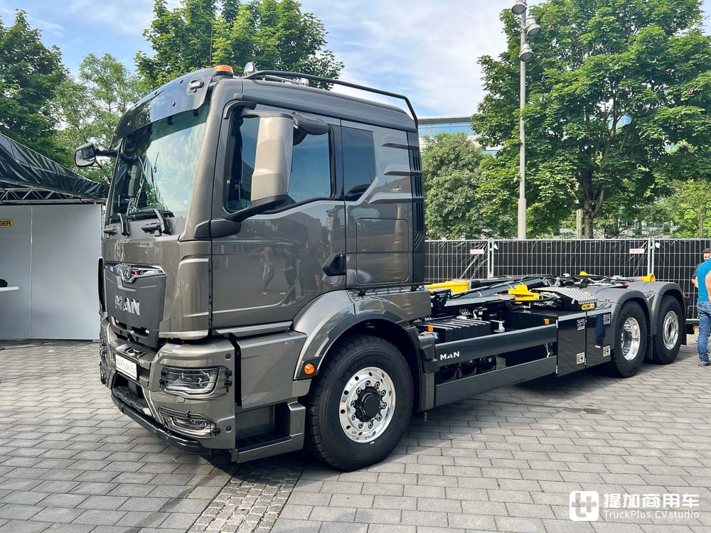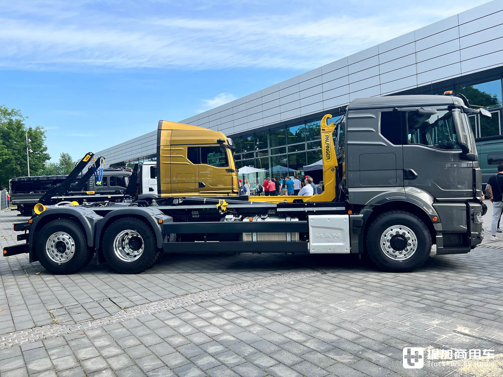 上装方面,车辆搭载了来自奥地利帕尔菲格的拉臂钩系统。它的特点在于:与不同的货箱搭配使用,车辆就能实现不同的功能,有些类似交换箱的效果。在欧洲,这类车型一般用于建筑工程领域。