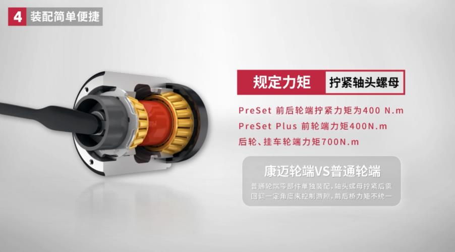 康迈轮端总成装配到轴头上,按规定力矩拧紧轴头螺母即可,操作简单便捷,前后轮端力矩统一为400NM。而普通轮端:零部件单独装配,轴头螺母拧紧后需回调一定角度来控制游隙,前后桥力矩不统一。