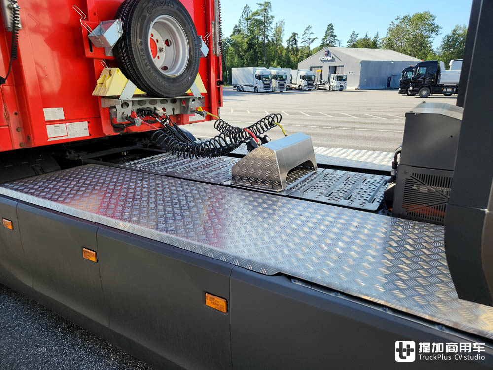 整个底盘上方都采用花纹钢板进行覆盖,将电池组严严实实的包裹在其中。同时,用于连接挂车的电气线缆接口位于车身中部,一看就知道这车是底盘车改装来的。此前,斯堪尼亚仅为25 P车型提供两速变速箱的电驱动总成,该总成型号为GE21S21,具备230千瓦持续功率及295千瓦持续功率。GE281的加入,丰富了25 P系列电动卡车的可选项。