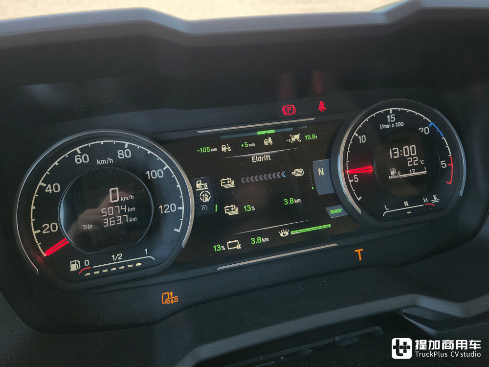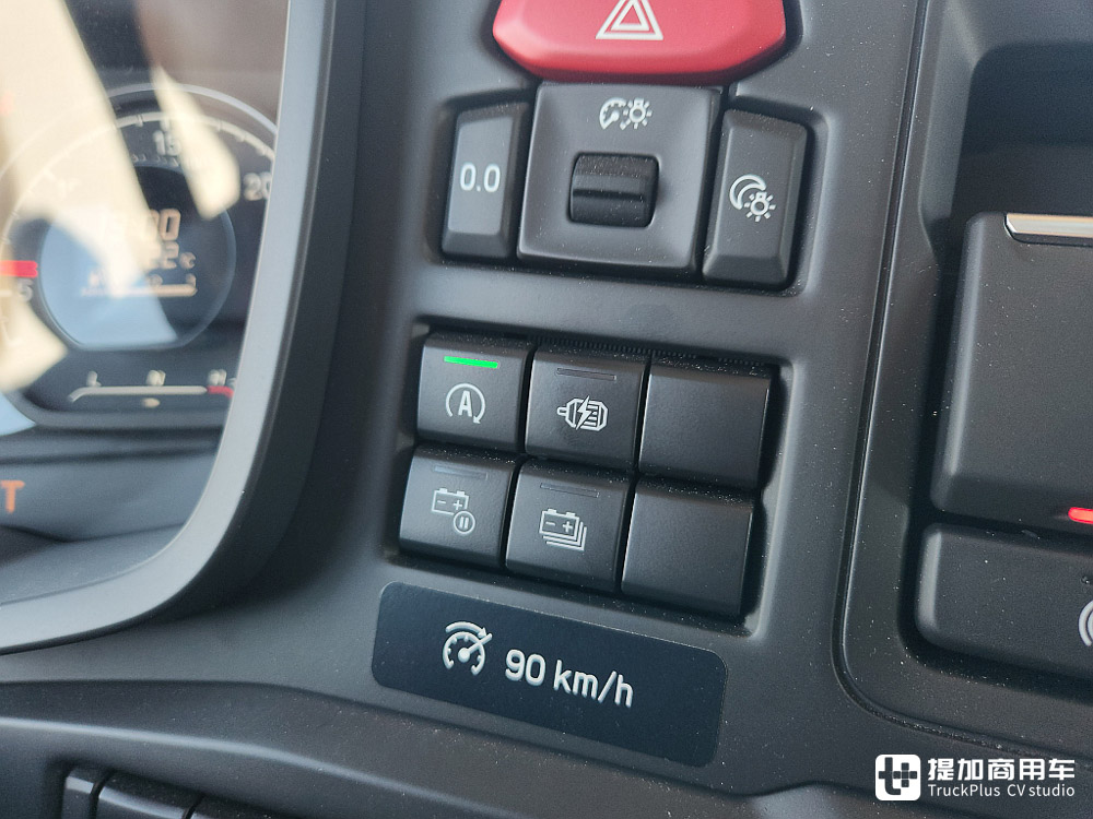 当然,内饰也一样。原本用于容纳柴油机的发动机鼓包被保留,其下方容纳了部分车辆低压电路系统的元器件。想要彻底消除鼓包?就得等到纯电平台了。
