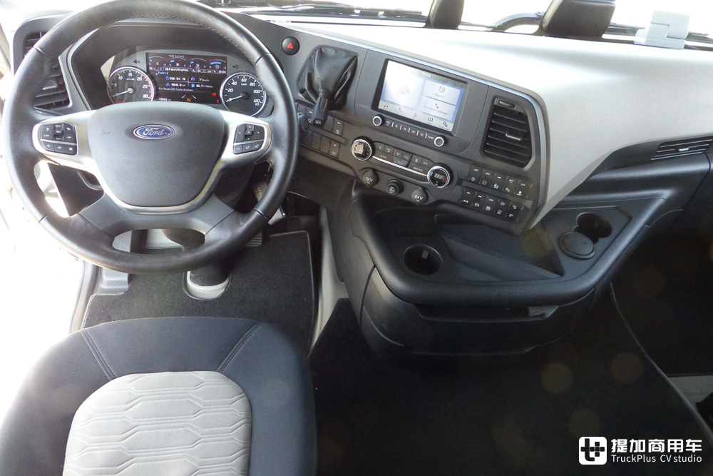 进入车内。福特F-MAX的仪表台设计比较复古,但人机工程学还算不错。仪表台采用了环抱式设计,面向驾驶员,便于操控。仪表台中央设计了储物抽屉及杯架等,与中部的发动机鼓包相融合。