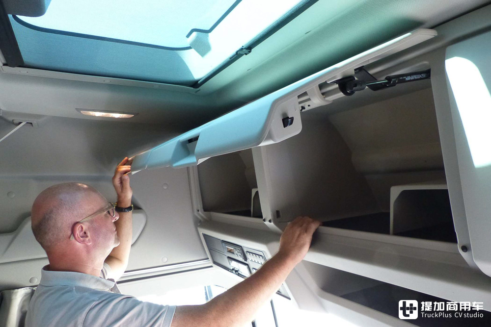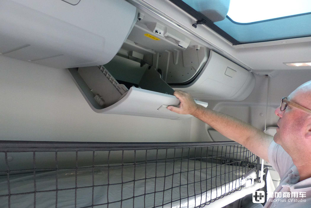 得益于方正的车身轮廓,驾驶室前部的车顶储物柜也有着不错的空间
