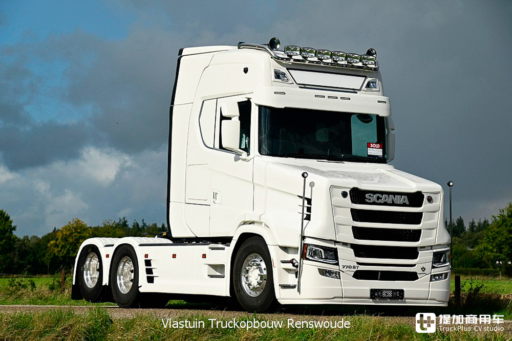 上图便是我们今天文章的主角啦。它基于斯堪尼亚770 ST五轴10x4底盘打造,底盘的改装由荷兰Vlastuin Truckopbouw进行。在改装过程中,Vlastuin Truckopbouw将原车的驾驶室拆卸下来,并将其向后移动一米左右。之后,他们会为发动机打造专属的引擎盖,塑造全新的长头外观。