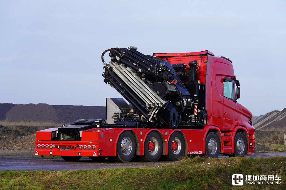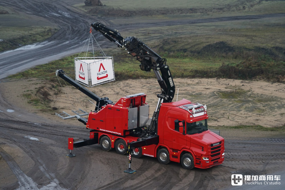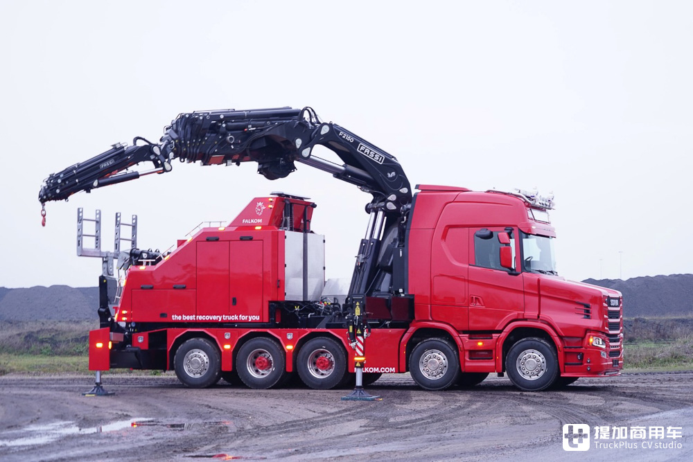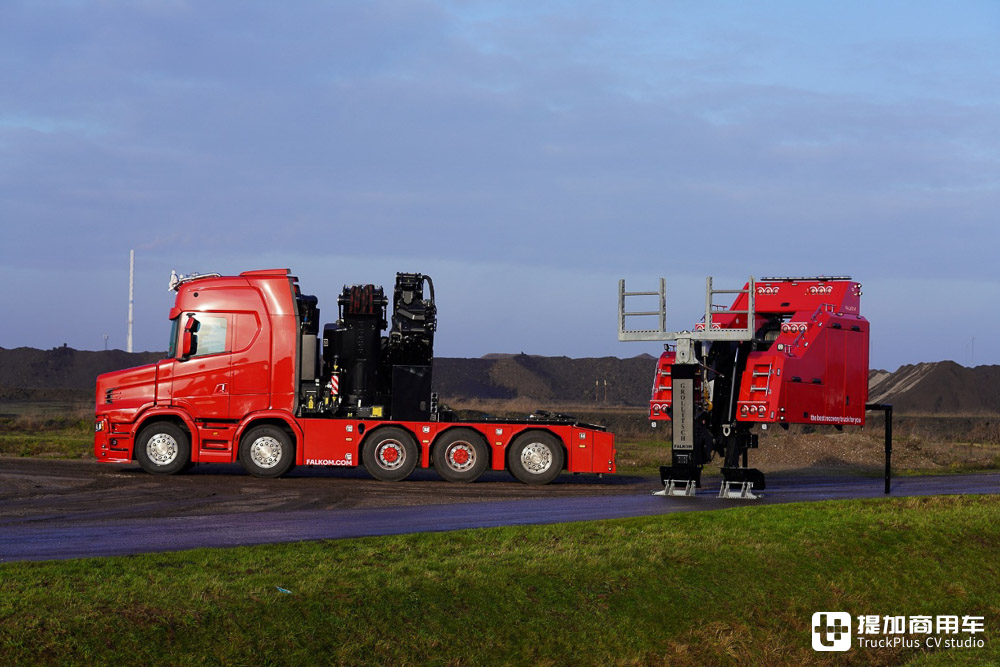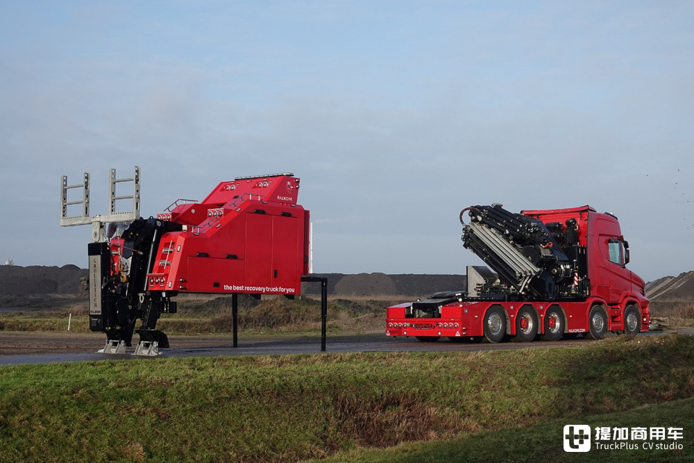 上装的打造由荷兰清障车专业户Falkom公司负责,型号为FAW 20000RE。在车身中部,这台斯堪尼亚770 ST清障车搭载了一台巨大的随车起重机,它来自起重专业户FASSI,型号为F2150RA。这款随车吊的最大起重力矩达157吨·米,搭配副臂时的最大工作半径达31.3米。