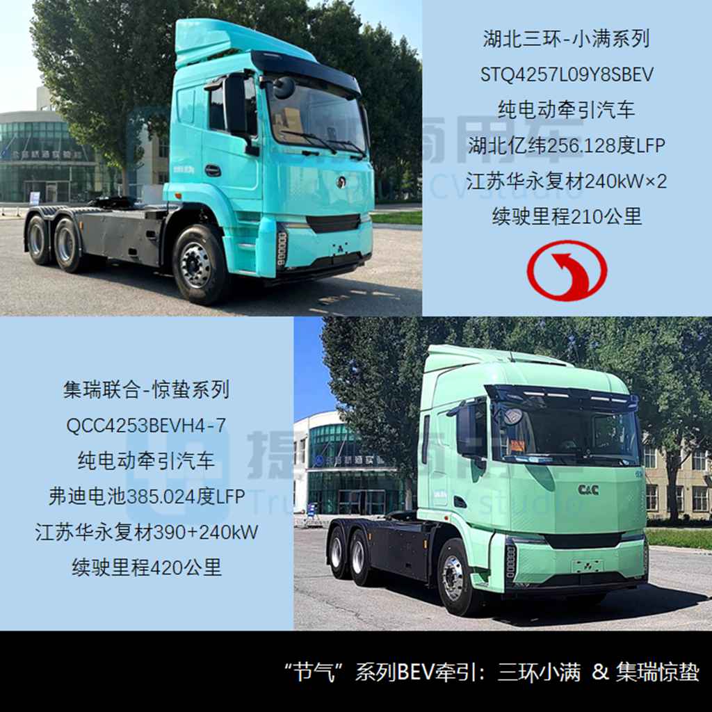 - 另款为集瑞联合-惊蛰系列QCC4253BEVH4-7纯电动牵引汽车,轴距较三环款增加20mm,主要参数与结构同上月期新品,同样采用弗迪385.024度LFP动力电池,电驱系统则更换为江苏华永复材390+240kW方案,最高车速89km/h,续驶里程420公里。江苏华永目前有单/双电机、两到四挡等多种电驱桥方案,且务实的采用了异种规格电机组合(重汽已有类似方案)和三挡变速方式(更为实用!),值得广大电驱玩家重点关注。