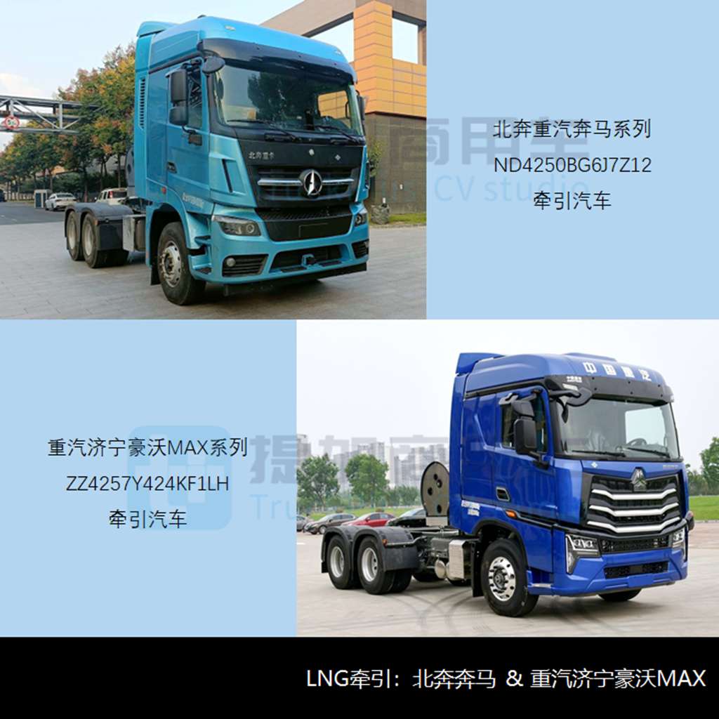 - 首先是LNG牵引类。作为行业极其稳定的中坚力量,北奔重汽在牵引市场端已实现“11连增”,本月期对新近推出的奔马系列进行燃气化,申报了ND4250BG6J7Z12牵引汽车,准乘2人,LNG气瓶驾驶室背置方案,准拖40/39.2吨挂车,可选两组板簧悬挂,匹配潍柴560/530马力气体机,最高车速89km/h。