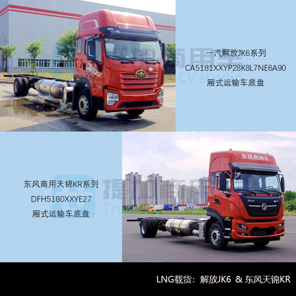 - 其次是平时不多见的LNG重卡类,除了市政环卫类专用车辆外,目前行业仅有22款18吨厢运XXY载货车型,且大多为重汽/一汽/东风底盘。本批后两者也有相关新品问世,首先是一汽解放JK6系列CA5181XXYP28K8L7NE6A90厢式运输车底盘,车宽2.47米、准乘2/3人,轴距7.1/5.6米,LNG气瓶轴间两侧底置,可选四组板簧悬挂,匹配玉柴6.87L、260马力气体机,与厢运版同期申报公告,形成整车后货箱长9.7/9.65/7.8米(对应两种整车长度规格),额定载质量9.47/9.4或8.67/8.6吨,载质量利用系数1.14或0.95,最高97或限速85km/h。
