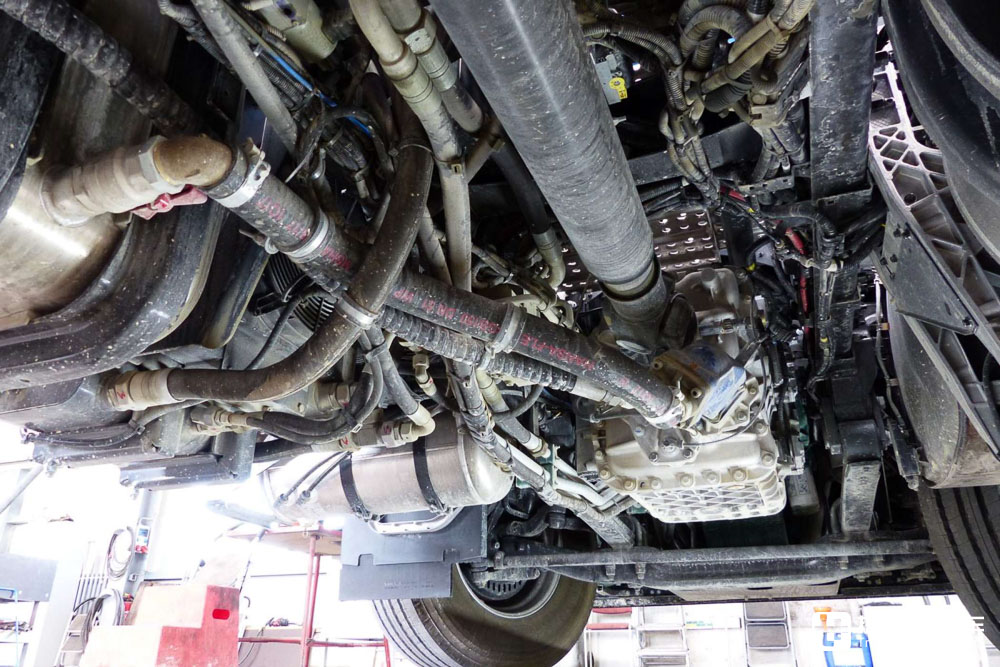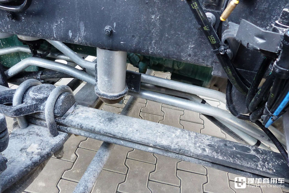 视角转向车辆底盘,可以发现:这台沃尔沃FH静液压驱动车型配备了两根传动轴,画面中央的小传动轴负责将取力器输出的动力传导至液压泵,而右下角那根机械传动轴则与变速箱连接,负责驱动车辆的后桥,
