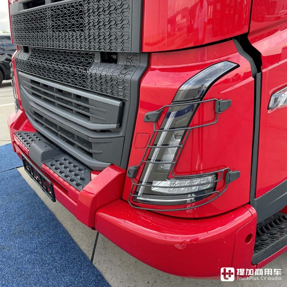 针对工程领域使用,这台沃尔沃FH配备了三段式不锈钢保险杠,它的外表面采用工程塑料包裹,整体突出于车辆前脸,同时集成底盘护板,大大提升坚固性。前脸左右的V型LED大灯提升了车辆的照明效果,但其本身也是易损的高价值零部件。因此,大灯护网也自然而然的出现在了这台沃尔沃FH之上。