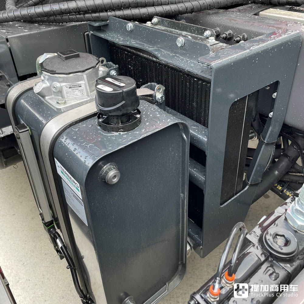 液压油箱和散热器采用叠放的方式集成于底盘侧面,靠外为油箱,靠内为散热器