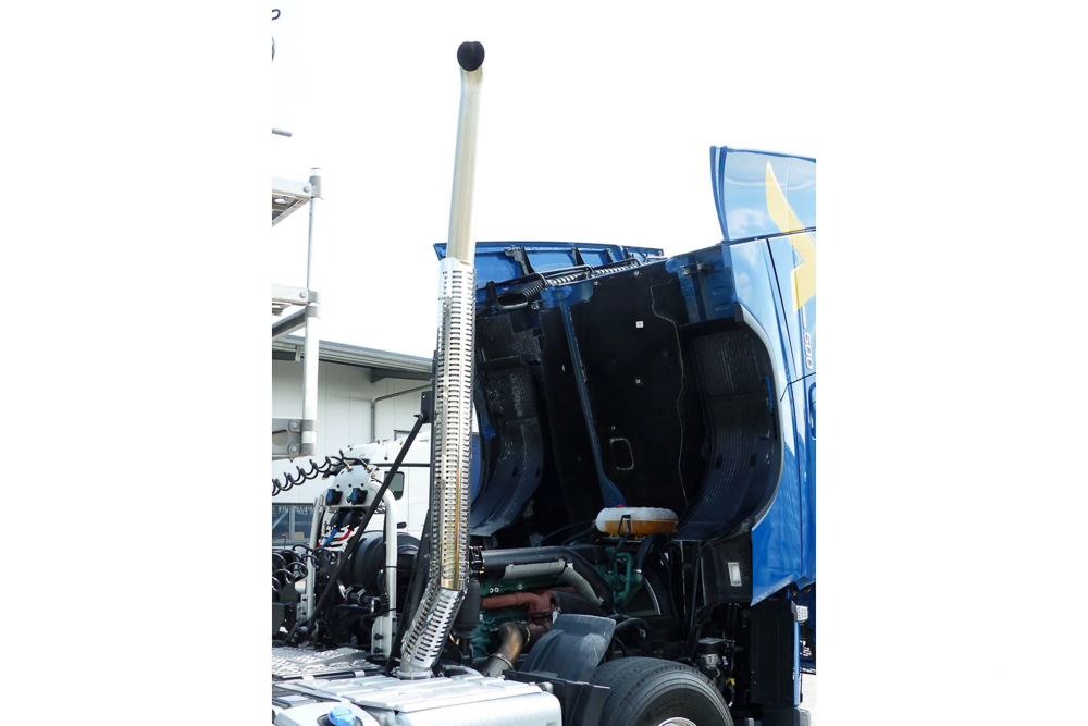 由于静液压驱动系统的液压油箱、散热器等零部件占据了底盘侧面的空间,因此这台演示车采用了竖置的排气。再加上紧凑的尾气后处理系统,通过直接向上排放,来减少排气在底盘上占据的空间。同时,也能够避免高温排气对液压系统带来影响。