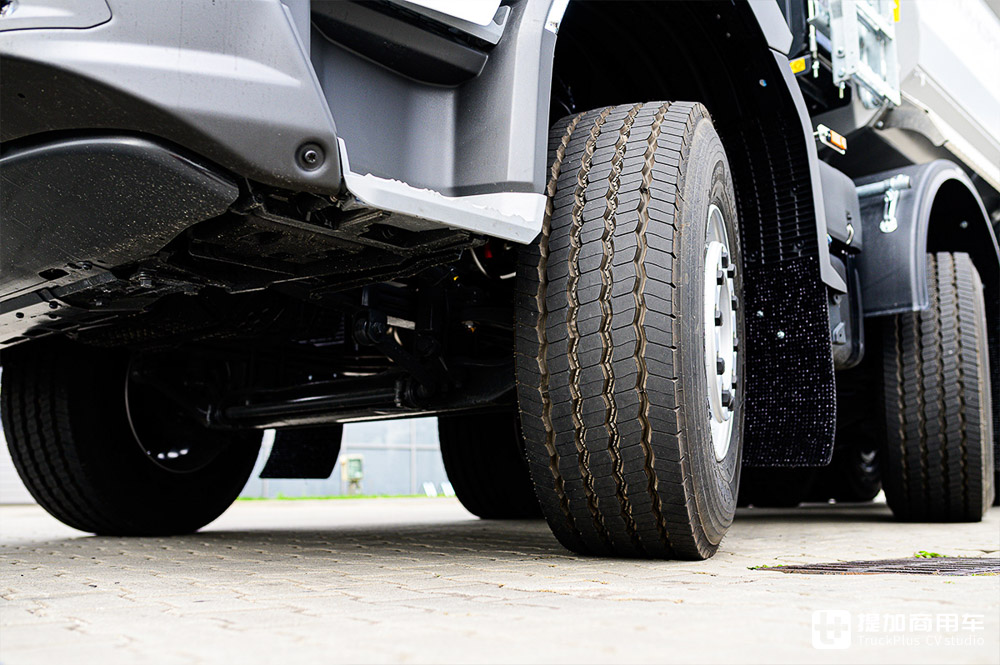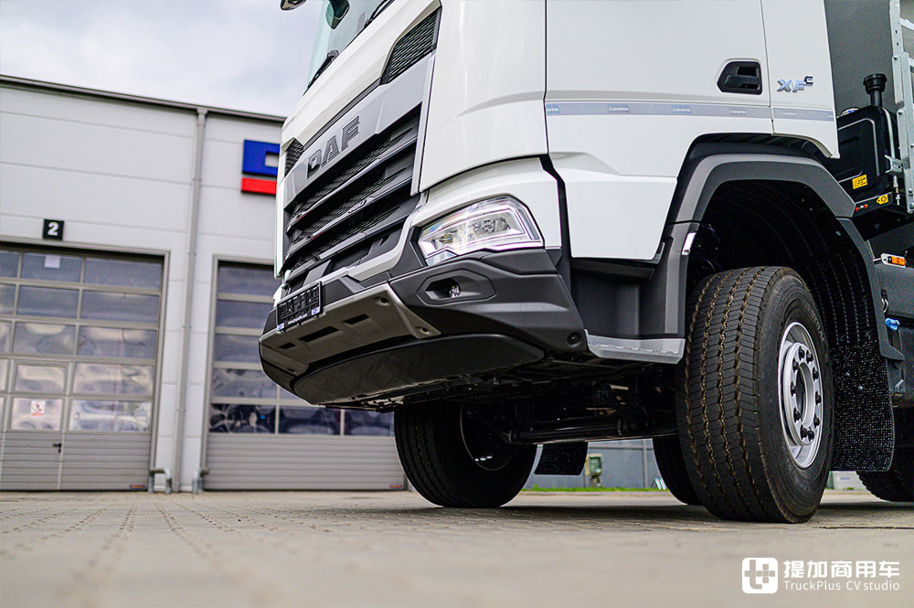 在驾驶室方面,达夫XFC与达夫XF保持了一致,采用了相同的大尺寸舒适驾驶室。不过,达夫XFC的驾驶室高度进行了抬升,进而塑造更高的离地间隙。与此同时,这台达夫XFC自卸车采用了固特异Omnitrac系列轮胎,这款轮胎是一款混合胎,既可用于公路,也具备不错的越野能力。