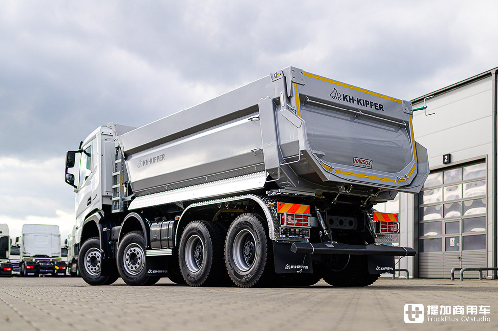 车辆的货厢由波兰本土企业:KH-Kipper打造,采用U型货厢设计,单缸前顶升结构。货厢本体采用Hardox高强度钢材,提升了耐磨性能,容积达到了19立方米。同时,车辆采用了被称之为Day Cab的宽体短款平顶日间驾驶室,为货厢让出更多空间