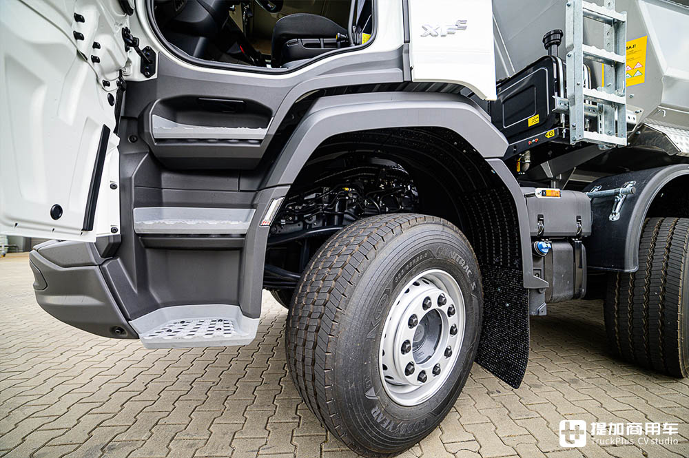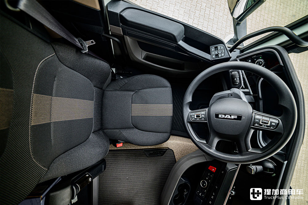 接下来,就让我们进入驾驶室体验一下。进入达夫XFC的驾驶室需要三级踏板,踏板宽大、进深较深,同时从下至上依次收缩,形似台阶,更方便登车。