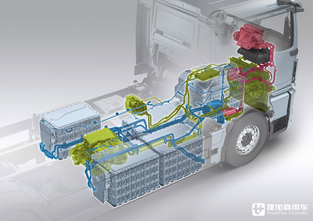 为了提升整车的能量利用效率,曼恩对eTGX和eTGS的车辆热管理系统进行了精心设计。车辆共搭载三套冷却系统,一套用于电池组温控,一套用于中央电驱动系统散热,而另一套则用于驾驶室的环控。曼恩将这三套冷却回路与热泵系统和中央散热器相连接,合理分配热量,保障驾驶室内部舒适同时,为电池、电动机塑造更良好的工作温度。