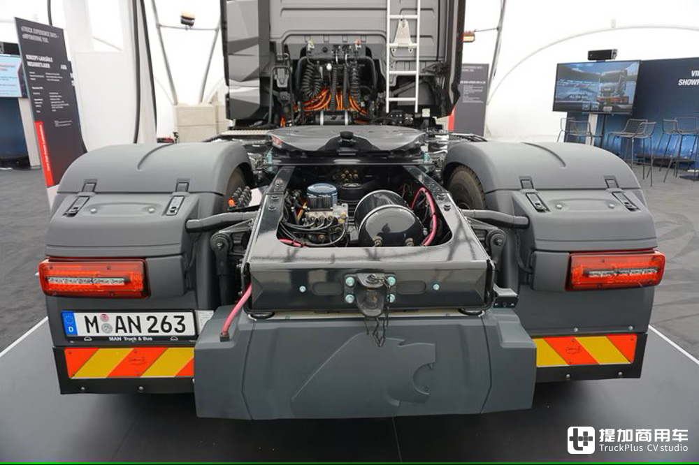 得益于模块化的电池设计,还有灵活的底盘设备排布,曼恩eTGX能够实现3.75米的短轴距,进而适应广泛的全尺寸挂车。此外,曼恩eTGX的鞍座高度得到了压缩,能够牵引内部高度为3米的挂车,实现“低鞍座牵引车”的运输任务。