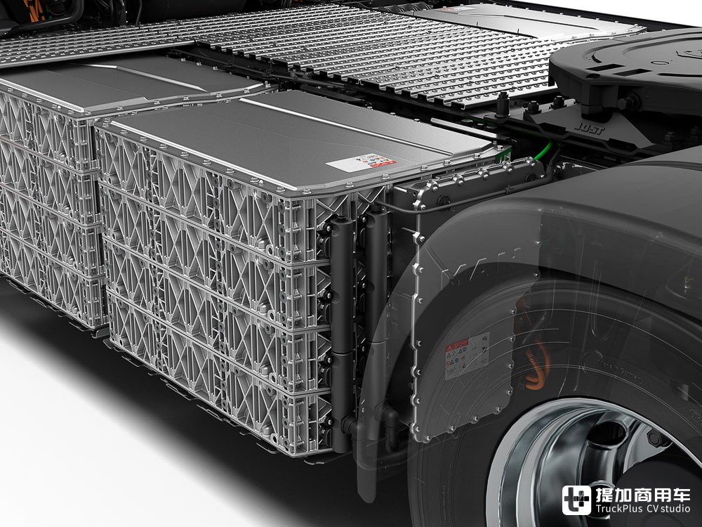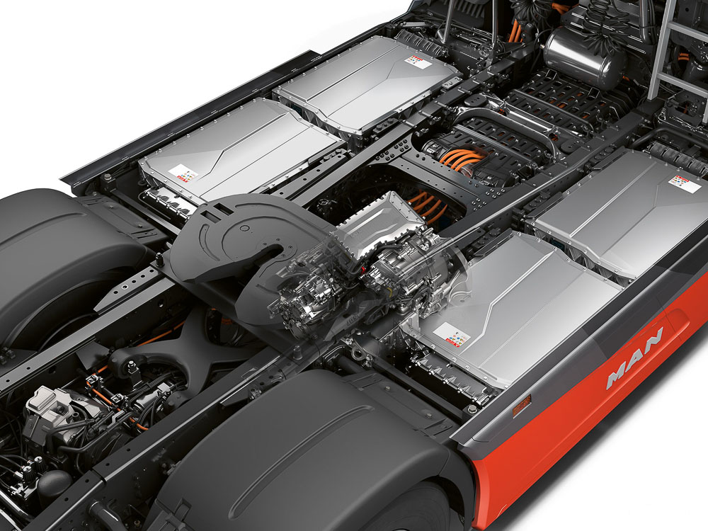 作为一款标准的“油改电”车型,曼恩eTGX与eTGS取消了驾驶室下方的发动机。为了起到配重效果,曼恩在驾驶室下方隐藏式搭载了两组电池组。其余的电池组安装在底盘侧面,可根据需要来搭载不同数量的电池组。eTGX与eTGS最少搭载3组电池,最多搭载6组电池,每组电池的电量为80千瓦时,整车最大电量为480千瓦时。