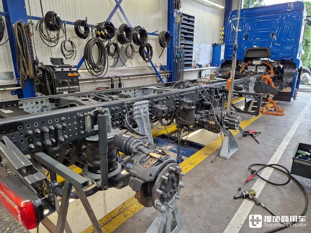 在拆空零部件之后,第二道工序便是对车桥进行重新定位。为了提升车辆的载荷能力,Veldhuizen为这台奔驰eActros 400增添了一根全新的随动桥。同时,Veldhuizen对车辆进行了测试,从而将前桥的载荷提升至了10吨。在重新定位后,车辆的第一、第二、第四桥为不带动力的随动桥,而第三桥则是原车的集成式电驱桥。