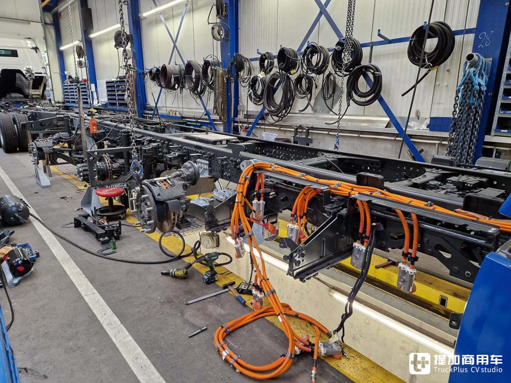 在完成电池的安装工作后,便是安装车辆的轮胎。之后,车辆便能够自行支撑,进行下一步的改装工作,集成电动取力器等零部件。说是电动取力器,其实它更像是一台电动机,从高压电池取电,之后直接推动上装工作。与传统柴油卡车的机械式取力器来说,它俩的相似之处也就只有“取力器”这个名字了。