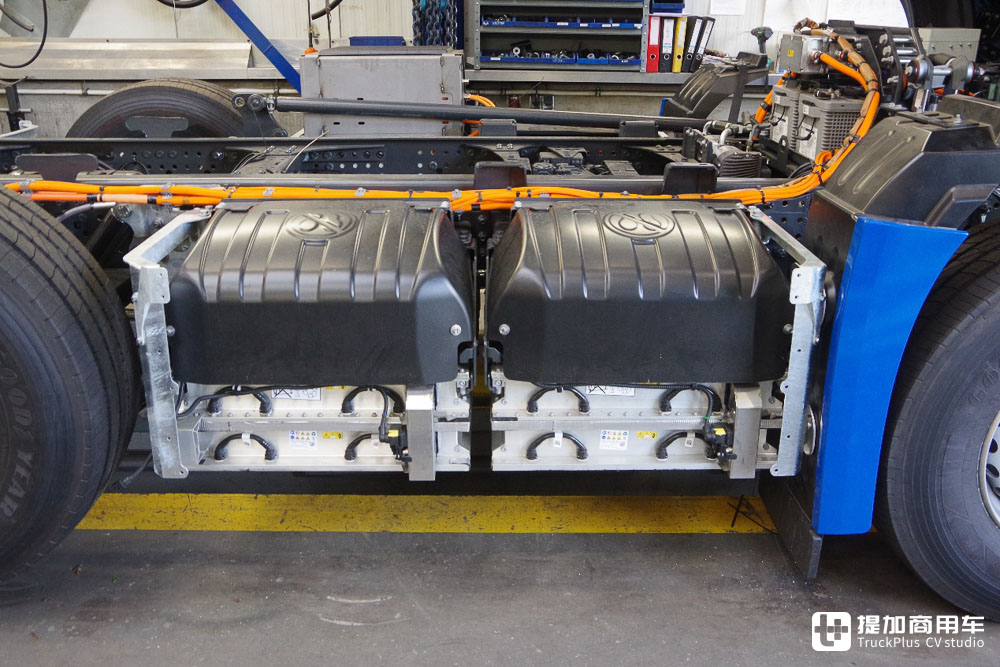 第一、二桥之间安装了两组电池,第二、三,第三、四车桥之间各安装一组电池,总共四组电池全部归位。在改装过程中,Veldhuizen对车辆的高压线路进行了修改,从而为电池移位创造了可能。低压电池组位于驾驶室下方,改装过程中并没有对其进行改动。低压电池将负责驱动车辆的仪表、灯光、空调等设备,与高压电池进行配合。