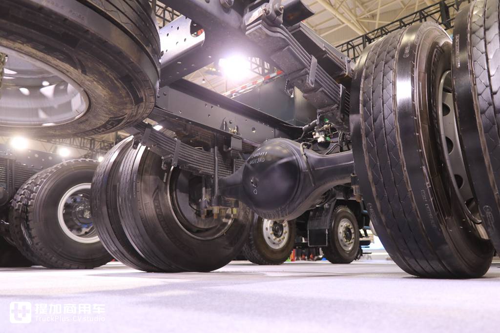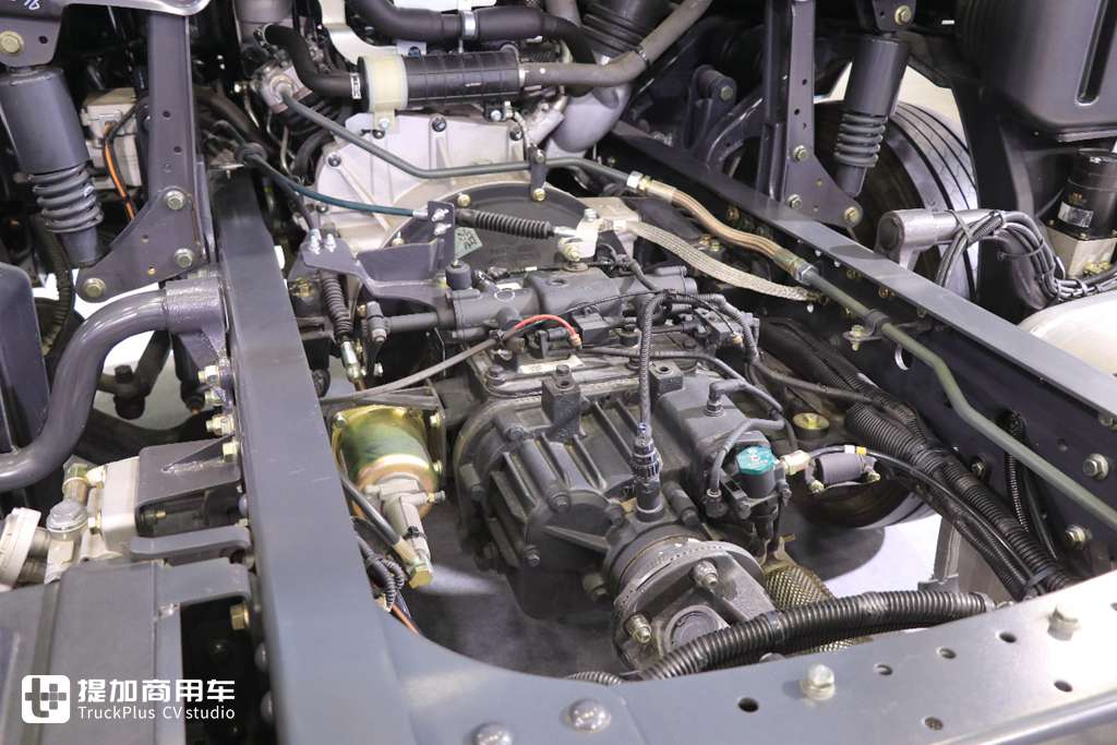 后桥匹配的是德纳9吨级轻量化单级减速桥,速比4.11,针对高效绿通用户还可以提供更小的3.7速比。车桥轮端的换脂周期为6万公里,可选免维护轮端,以提升车辆出勤率。