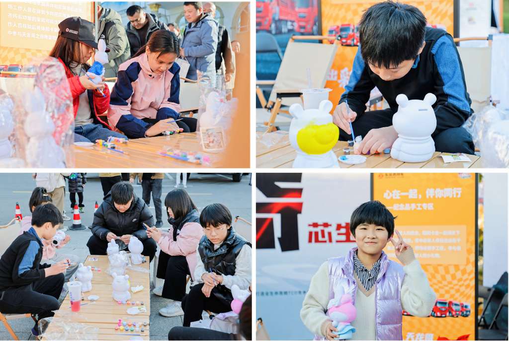 在三站线下活动场地,最吸引卡友和家人驻足的是形式各异的游戏互动区。在这些区域里,有东风商用车和当地经销商用心筹备的互动游戏和小礼品。一站到底问答互动、通关打卡抽奖、爱的明信片、手工涂鸦绘画、指压板跳绳、转呼啦圈、……每一个小小的游戏,牵引出卡友和家人在时光里难得的放松和惬意,孩子们纯真的笑容、家人关心的呐喊、卡友久违的拥抱,构成了一幅幅美好的画面,温暖了东风天龙哥大赛(第7季)的赛场,也温暖了所有关注赛事的中国卡友的心田。