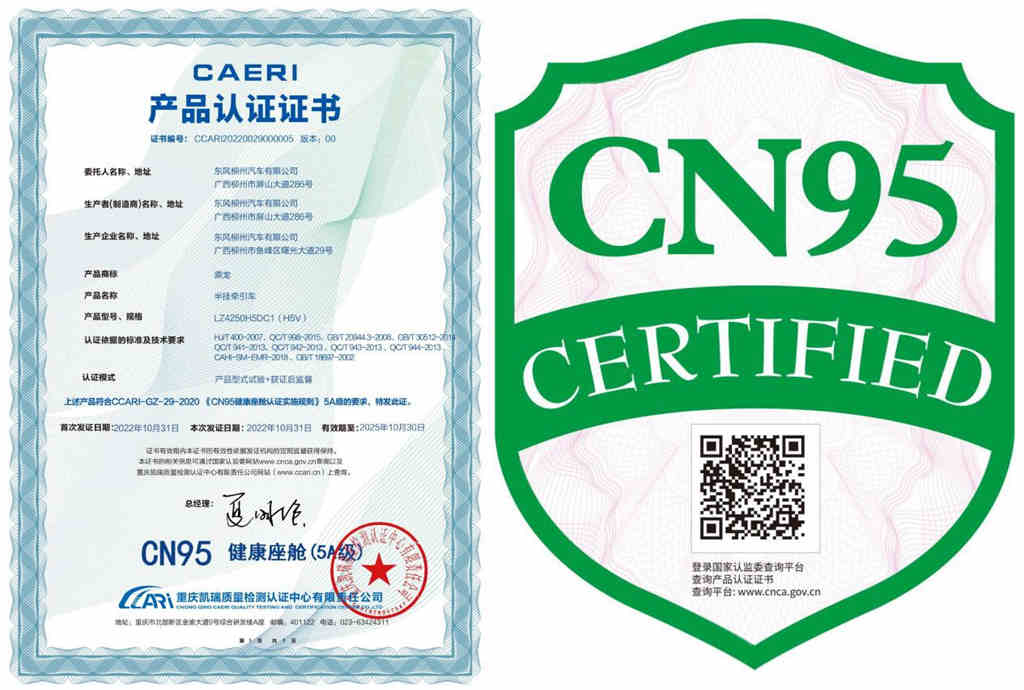 更值得一提的是,乘龙H5V LNG还配备了5A级健康座舱,这是由国内权威机构—中国汽研凯瑞认证,并获得了 “CN95健康座舱” 5个维度测评全部“5A”级最佳水平的认证证书及认证标识,这确保了卡友无论在工作还是休息时都能享受到更舒适、更健康的驾驶环境。