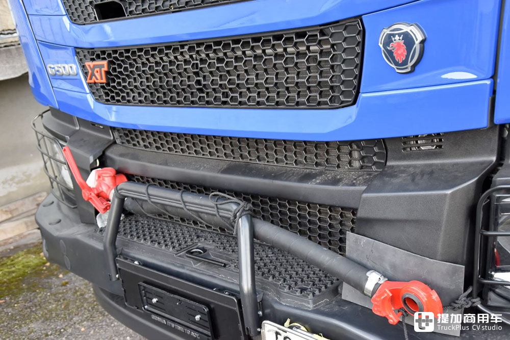 在保险杠上方,这两台斯堪尼亚G 500 XT均预留了一节橡胶管。它们是火车运行必备的制动风管,通过压缩空气来控制整列车的刹车系统,原理类似断气刹一般。风压高于阈值时缓解制动,低于阈值时制动。