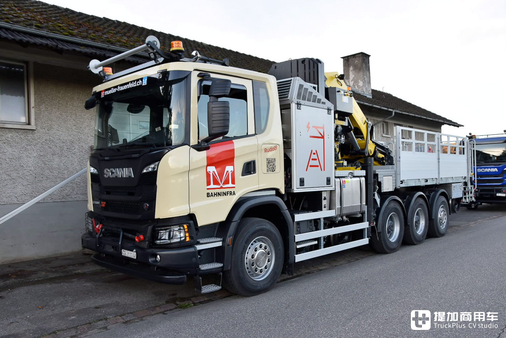 名为“Rudolf”的这台斯堪尼亚G 500 XT为接触网工作车,它的车尾安装有吊篮,可用随车吊举起,供人员检查高架的接触网。