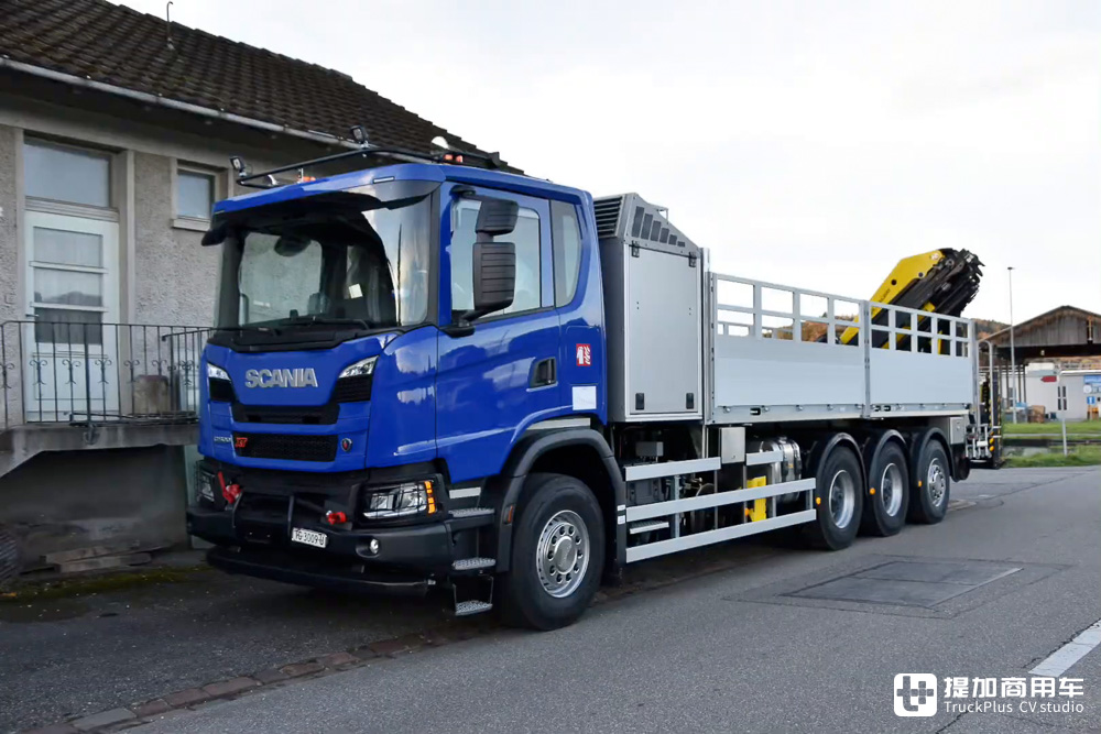 名为TAK2的蓝色斯堪尼亚G 500 XT将随车吊放在了车尾,工作范围更大,便于吊装各类材料